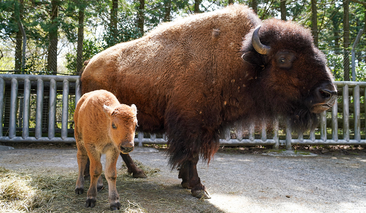 2026年4月12日、アメリカバイソンにオスの赤ちゃんが誕生しました!順調に成長していることから4月21日より母親と一緒にサファリゾーンへデビュー!!母親にすり寄って甘えたり、オッパイを飲んだりする愛らしい姿がご覧いただけます。