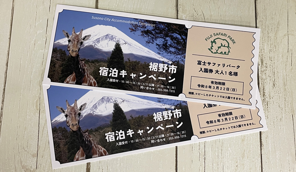 対象は、裾野市内の指定宿泊施設に泊まった方で、富士サファリパーク、またはスノーパークイエティのいずれかの入園チケットをプレゼントするお得なキャンペーンです。