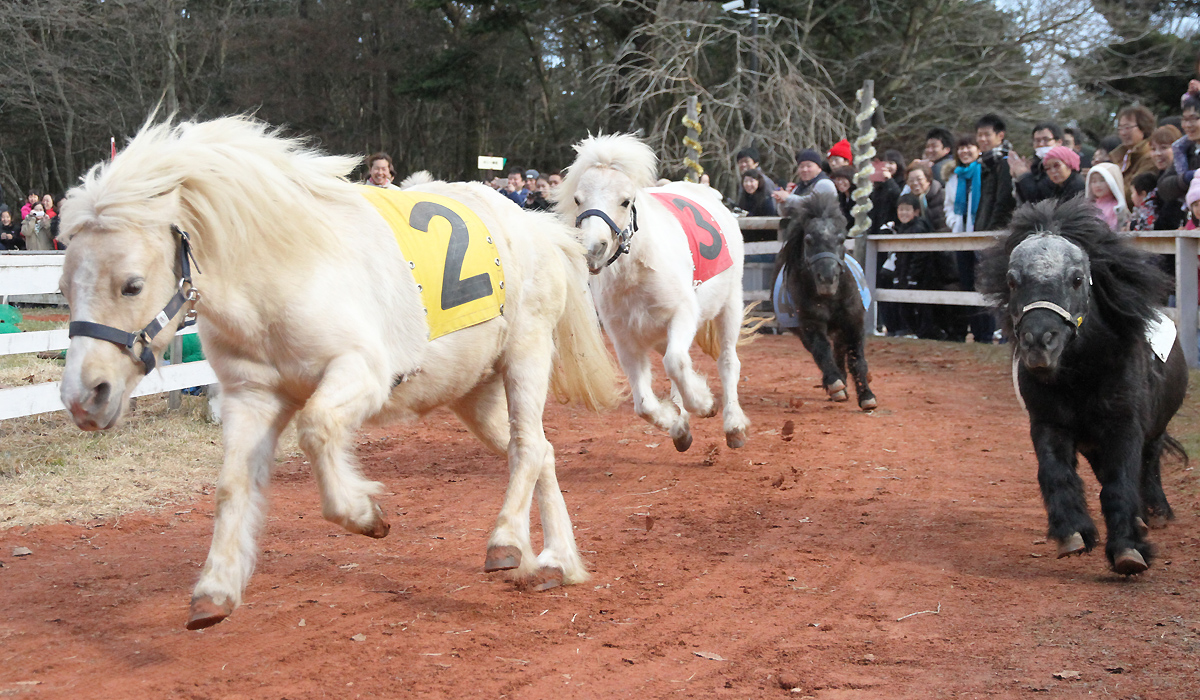 世界で最も小さな部類のウマ「アメリカン・ミニチュアホース」が1周約160メートルのコースを全力疾走!「勝ち馬投票券(1枚100円)」を購入し、見事1着のウマを当てるとオリジナルグッズをプレゼント!