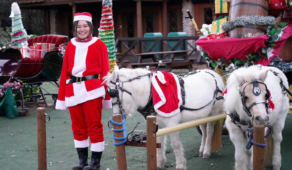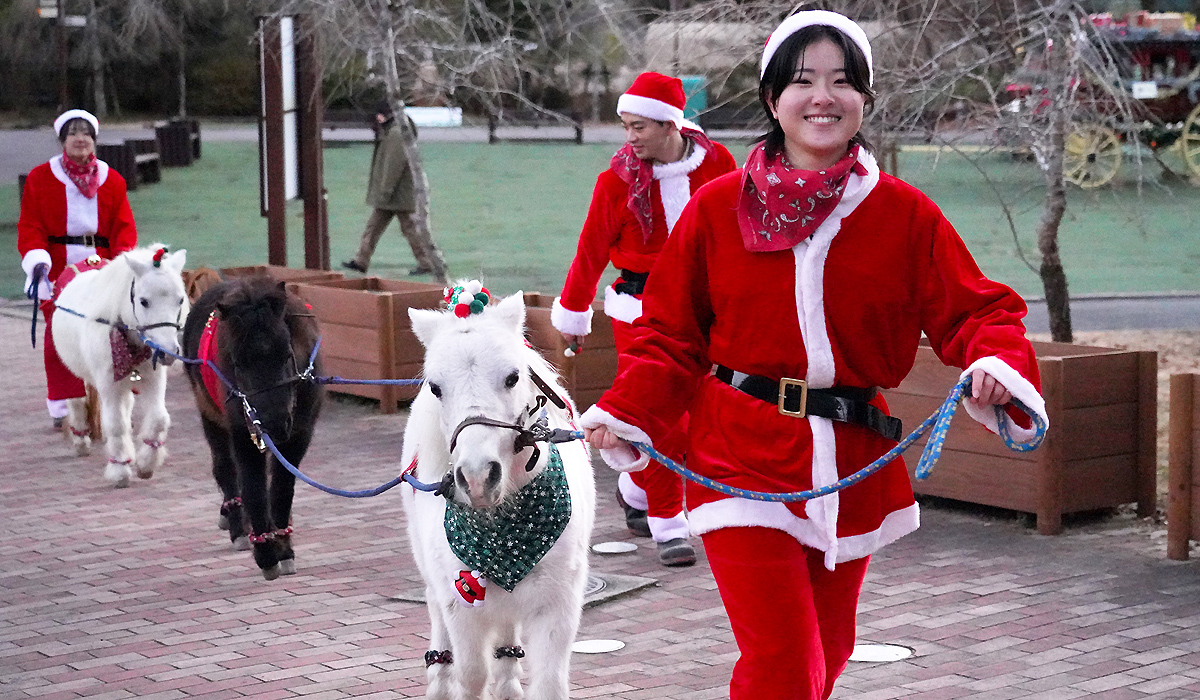 クリスマスの装飾を施したポニーやミニチュアホース、計10頭の隊列がふれあい牧場内を行進します。