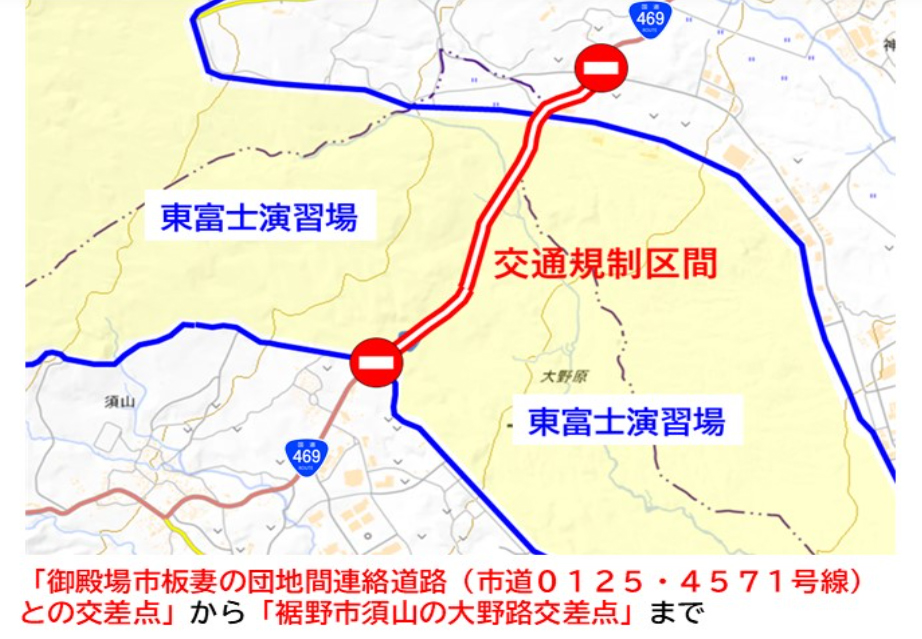 富士サファリパークから5㎞ほど離れた「東富士演習場」において、自衛隊による射撃訓練がおこなわれ、一時的に国道469号線が通行止めとなります。